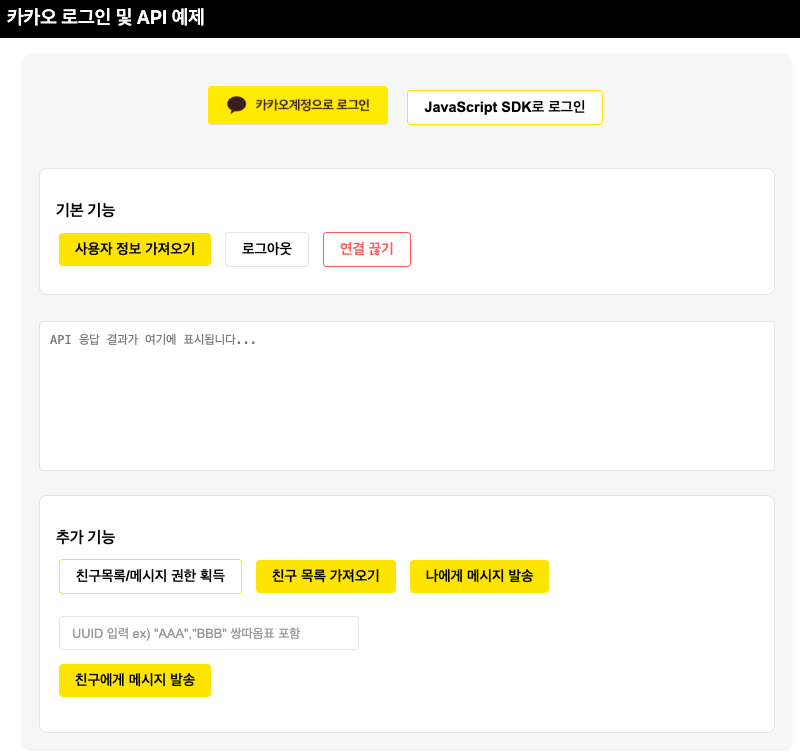 node.js로 “카카오 로그인, 카카오 카카오 친구목록 조회, 메시지 발송” 테스트 해볼 수 있는 간단한 예제입니다.