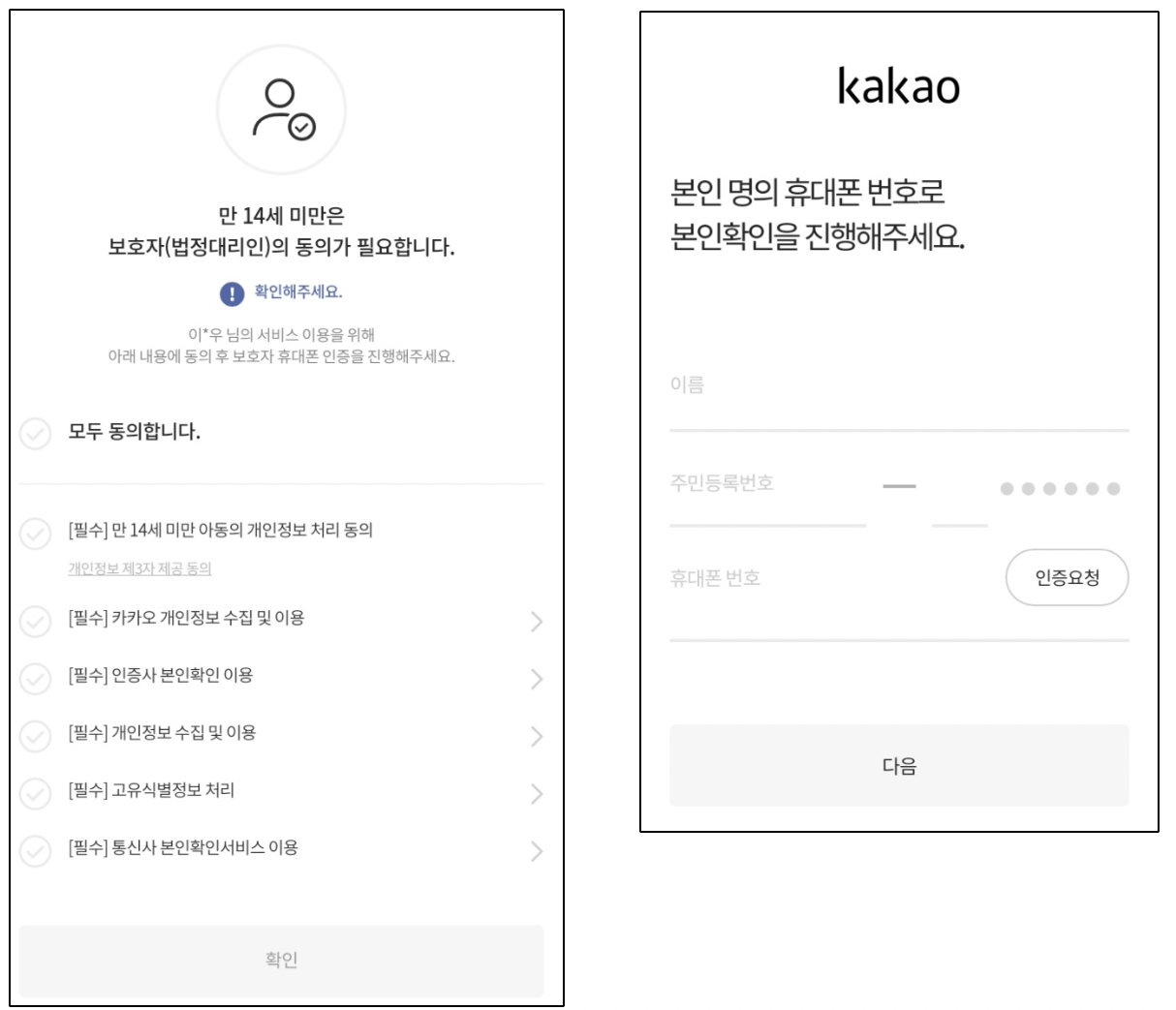 본인 확인으로 나이가 인증된 14세 미만 이용자가 카카오 로그인 시, "정보제공 동의" 이후 아래와 같이 법정대리인 동의절차 수행됩니다.