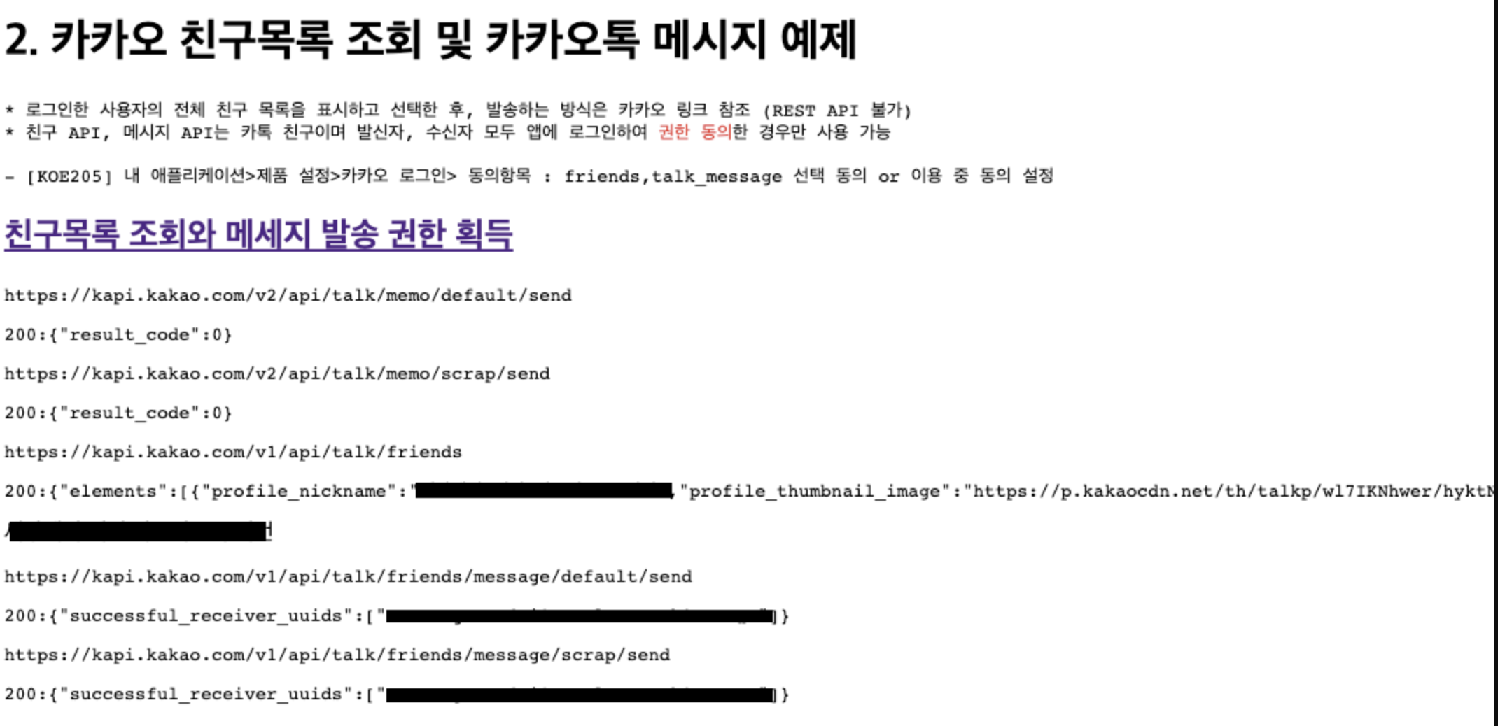 * 친구 API, 메시지 API는 카톡 친구이며 발신자, 수신자 모두 앱에 로그인하여 <font color="red">권한 동의</font>한 경우만 사용 가능